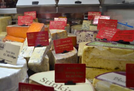 We sell an extensive range of local cheese. As we are based in Warwickshire the counter stocks many cheeses made in Warwickshire and the counties that immediately border. Cheeses with a red label are those designated as a local cheese to the farm shop and Northamptonshire Blue, Sparkenhoe Red Leicester, Cropwell Bishop Stilton, Cobblers Nibble and many more. Aside from these very local cheeses you will find all the major